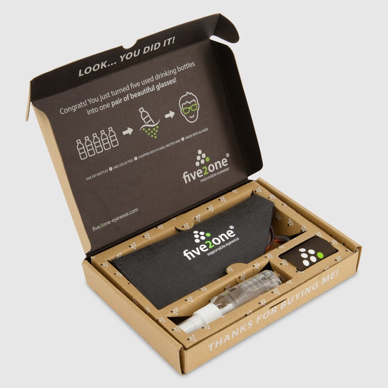 We ship all five2one frames in low-impact recycleable packaging. Designed to fit through a mail box and inlcudes cleaning cloth, spray and case.